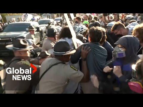 Scuffles broke out and arrests were made as demonstrations continued on Friday outside the Broadview ICE facility in Chicago. Dozens of protesters carrying signs, and wearing protective gear gathered outside the facility chanting and shouting. Friday's protest marks the fifth consecutive Friday of demonstrations at the Chicago processing centre. "Trump is trying to get Chicago to bow down. He's trying to get the entire country to bow down to his authoritarianism. He's trying to take away every one of our rights," said protester Eman. Occasional pushing and shoving broke out between protesters and police officers. Local media reported that at least 10 arrests were made in the first hours of the protest. Protesters say that individuals being detained are being deprived of basic necessities, such as beds, blankets, and access to hygiene facilities. For more info, please go to https://globalnews.ca/news/11456177/cyclist-taunts-ice-agents-chicago-video/ Subscribe to Global News Channel HERE: http://bit.ly/20fcXDc Like Global News on Facebook HERE: http://bit.ly/255GMJQ Follow Global News on X HERE: http://bit.ly/1Toz8mt Follow Global News on Instagram HERE: https://bit.ly/2QZaZIB #GlobalNews